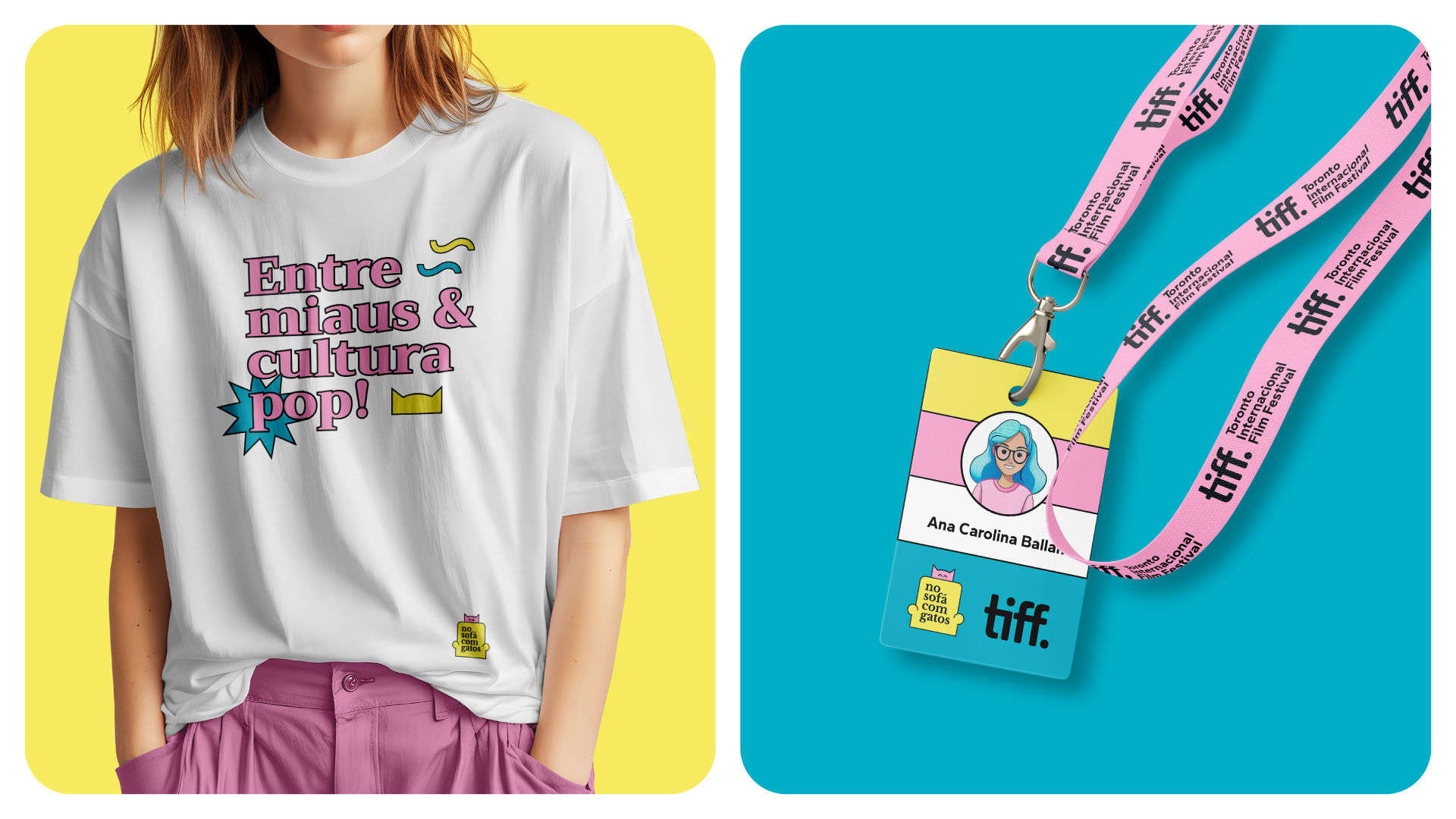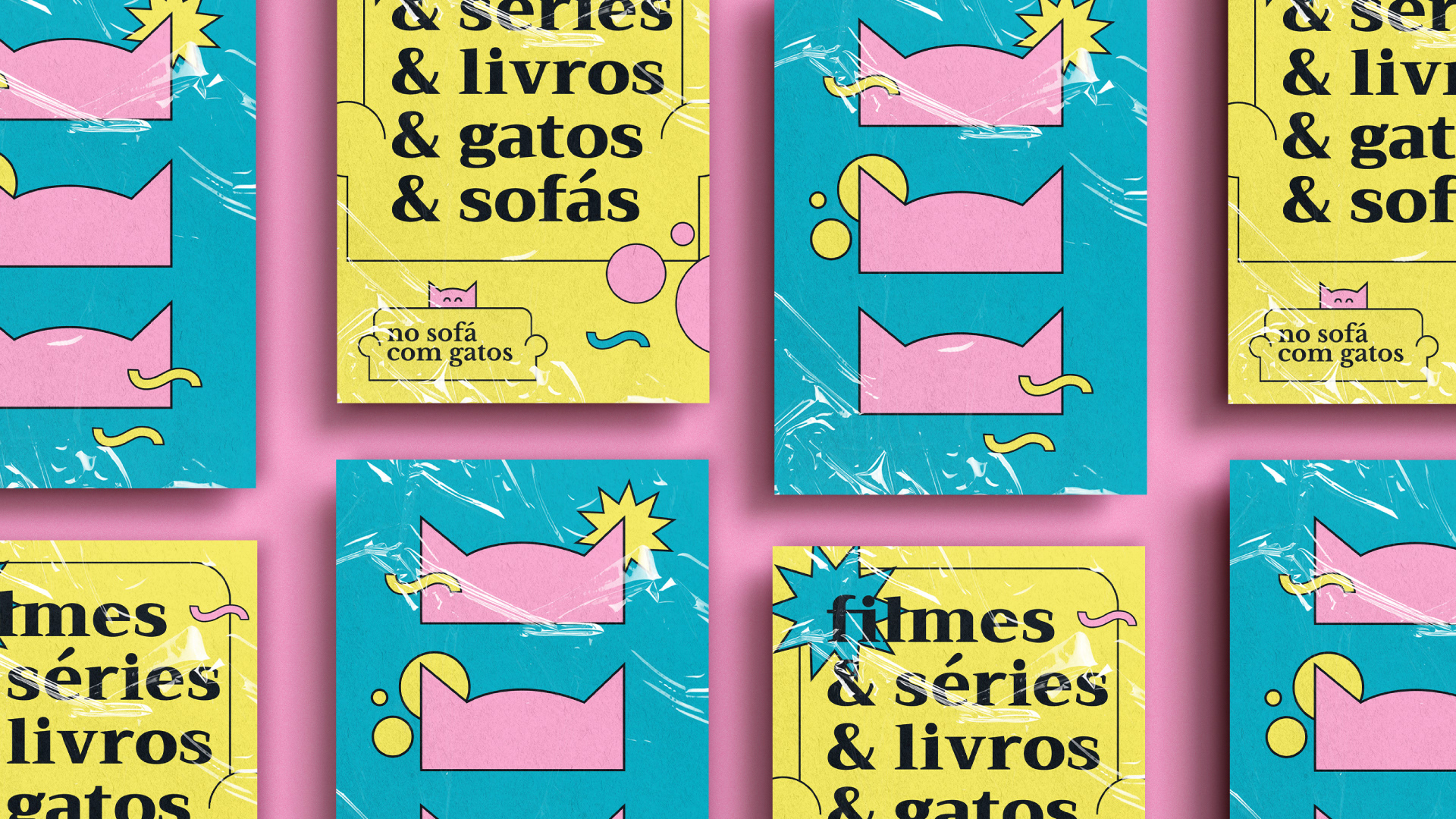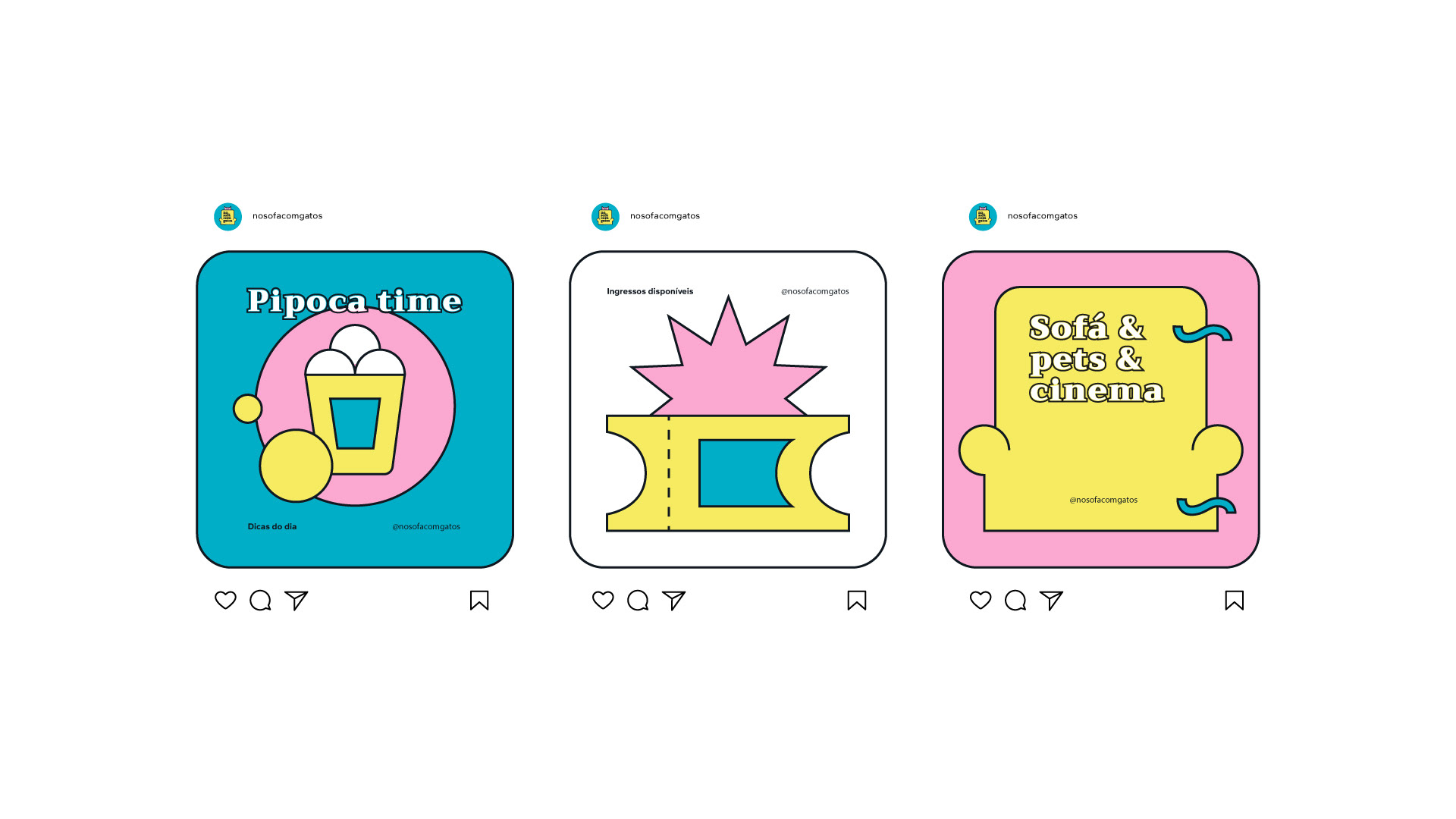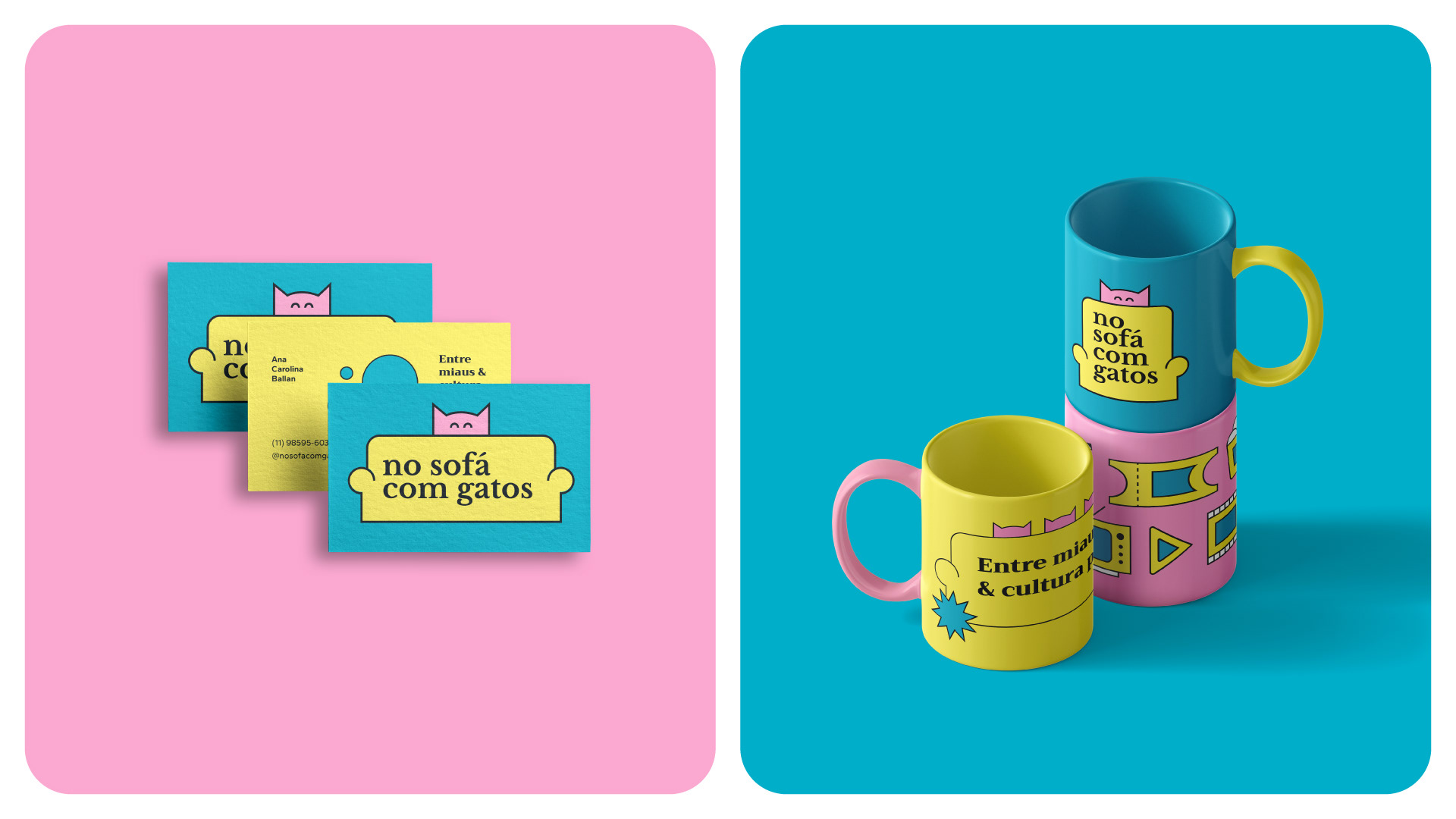 No Sofá Com Gatos (On the Sofa with Cats) was created based on the main references of its founder, Ana Carolina Ballan: her cats and the sofa, where she spent much of her time watching movies and series during the pandemic. This experience inspired the creation of a pop, minimalist, and humanized identity, reflecting her expertise in cinema and pop culture, directly connecting the brand to the audiovisual universe she shares.